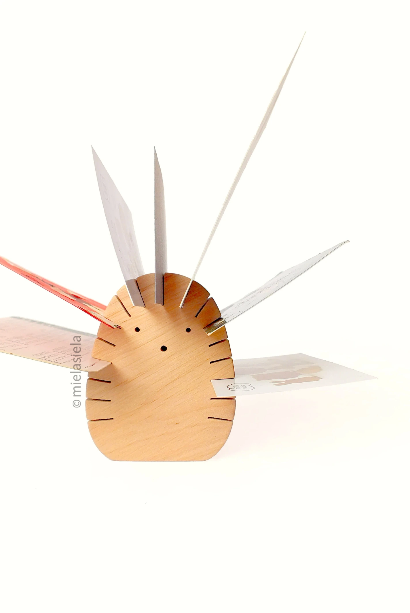 Natūralaus medžio ežiuko formos laikiklis su įstatytomis spalvotomis kortelėmis baltame fone
